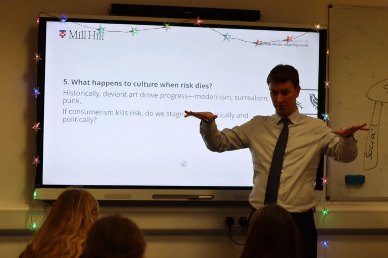This year’s workshops were of an exceptionally high standard, led by our talented Upper Sixth alongside senior and departmental staff. Highlights included Mr Hamshaw’s, Head of the 1729 Maths School, session on the mathematical theory behind compound interest, an insightful exploration of ‘Why We Buy?’ from an Anthropological and Psychological perspective by Edie W and Rhona U, and Mr Clayton’s, Deputy Head of Sixth Form, hugely popular workshop on how streaming services are reshaping scriptwriting.